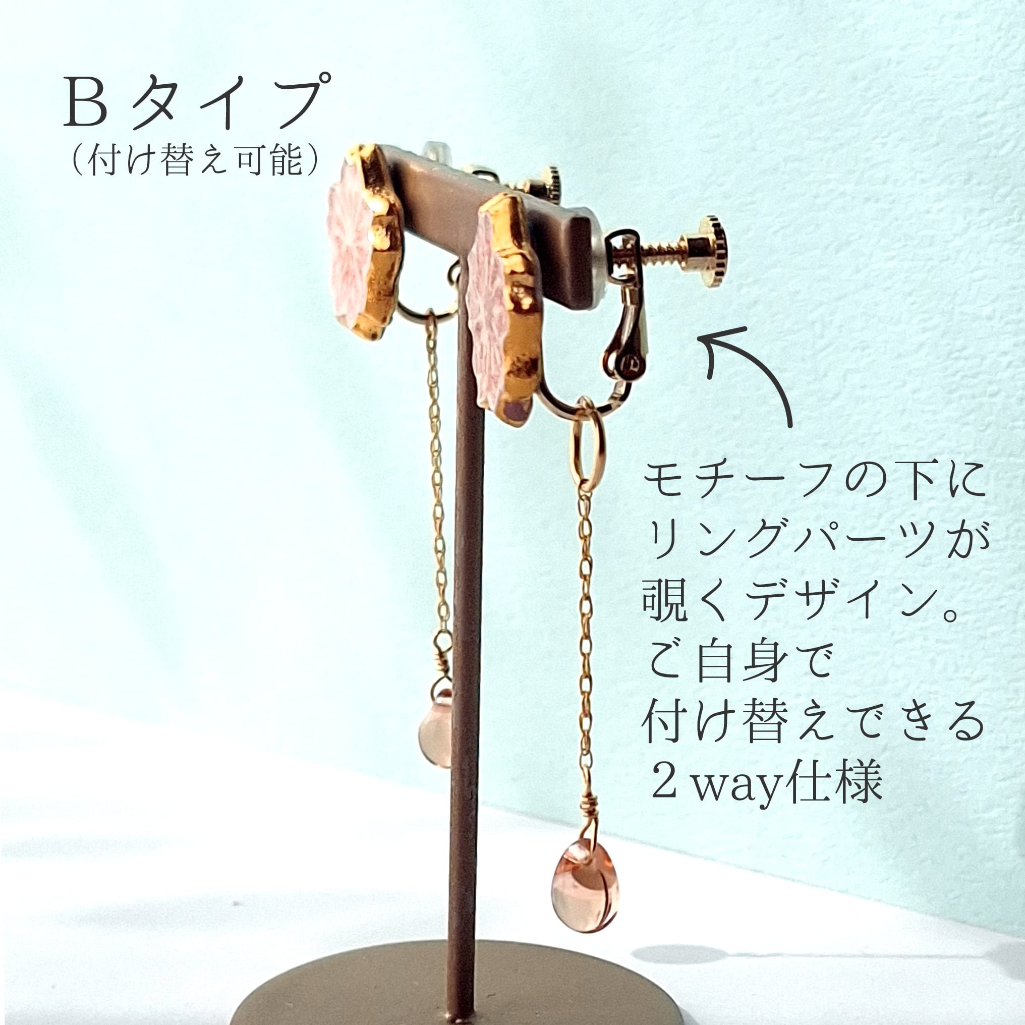 イヤリングのネジ側から、お客様ご自身で付け外しが出来るよう大きめのリングパーツでお作りした追加チャームです。