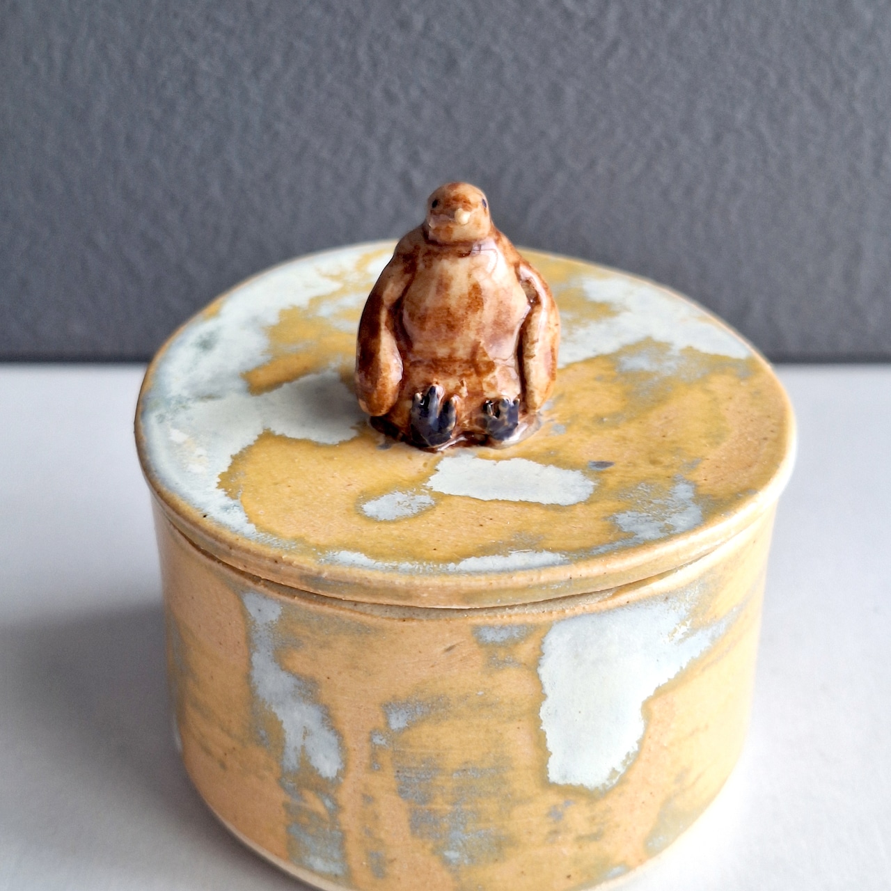 オウサマペンギンの雛がひょっこり生えている小さな陶器の蓋物です。