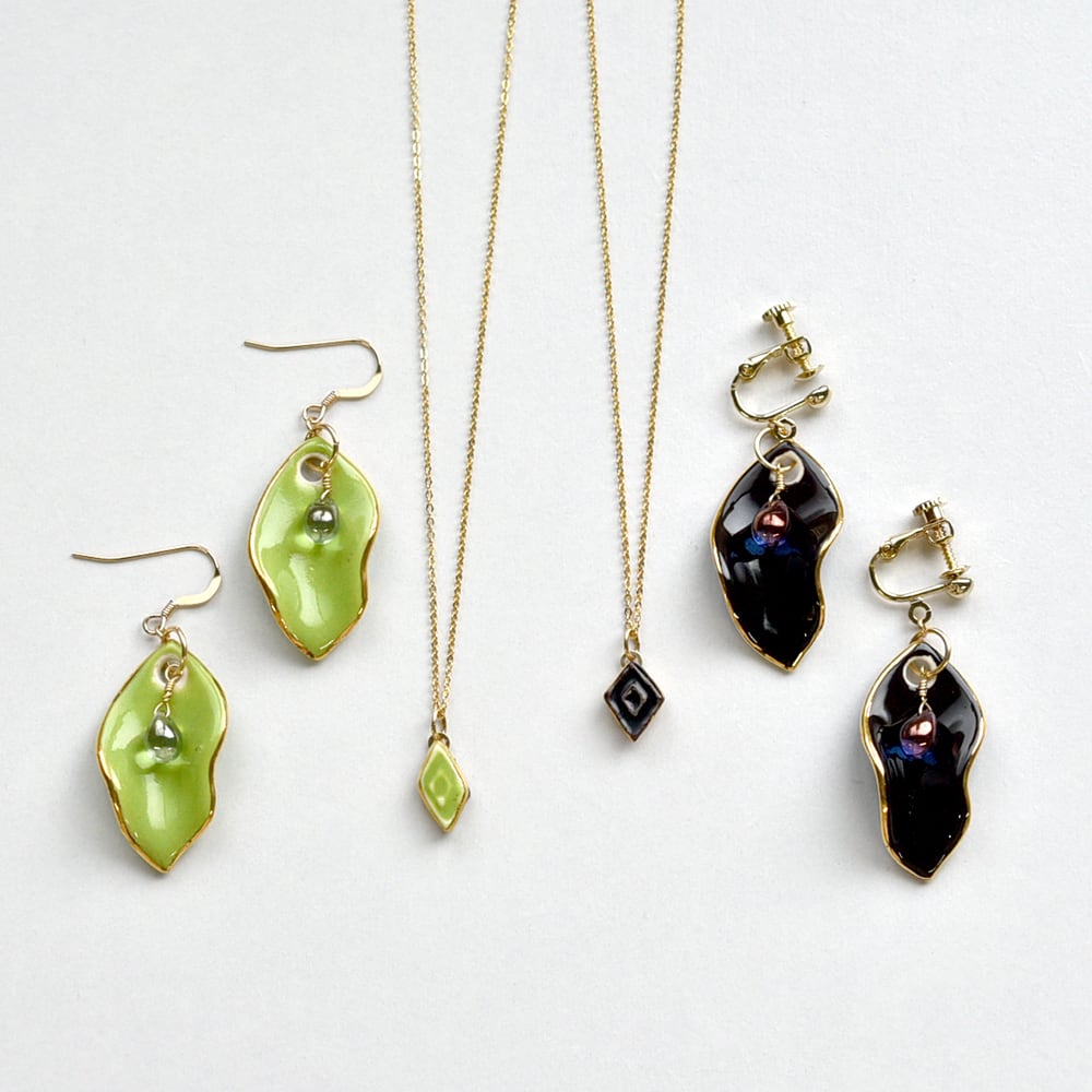 【限定カラー・各1点】 yuragu 耳飾り&ネックレスのセット福袋Nolismのロングセラーアイテム、yuragu耳飾りと同色のネックレスがセットになった福袋。グリーン・ブラック各1点ずつ限定ピアスorイヤリングをお選びいただけます。